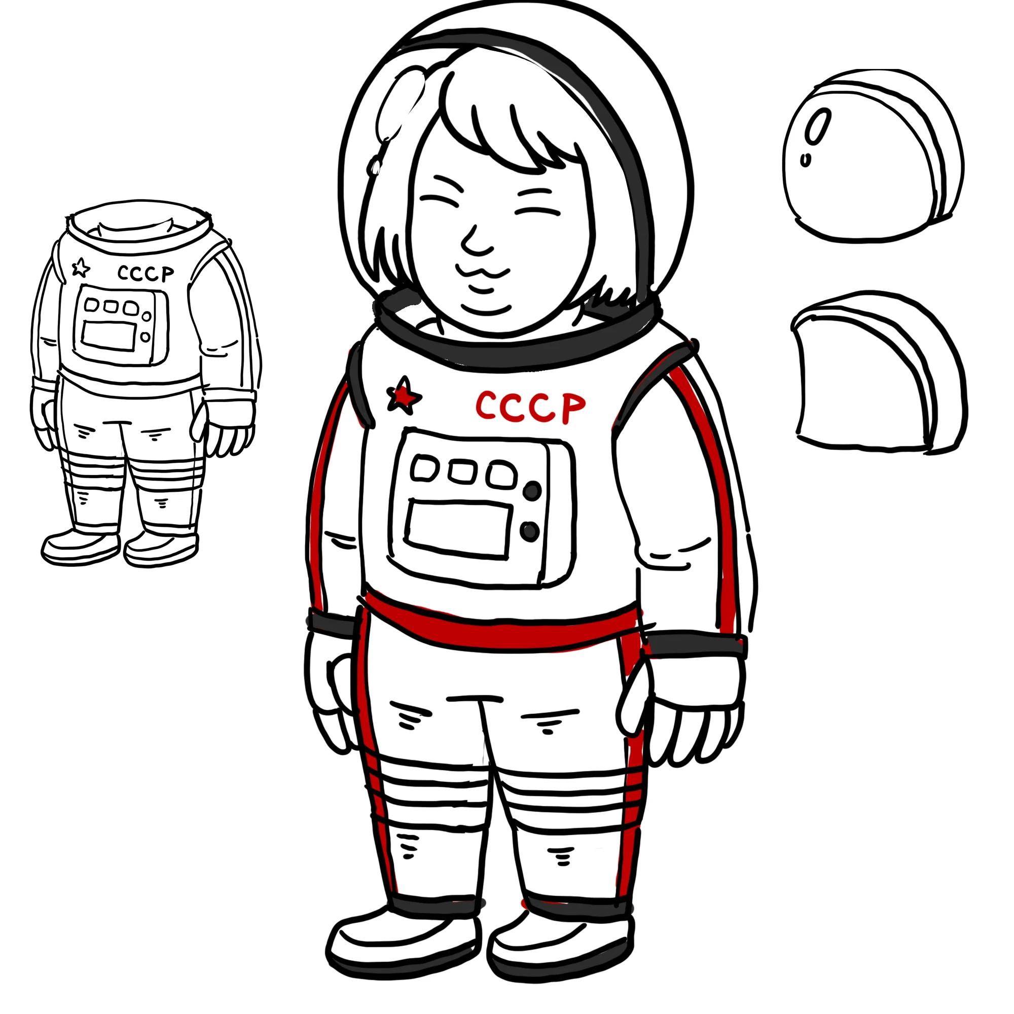 LingsCars mascot concept sketch: Cosmonaut Ling with modular helmet components