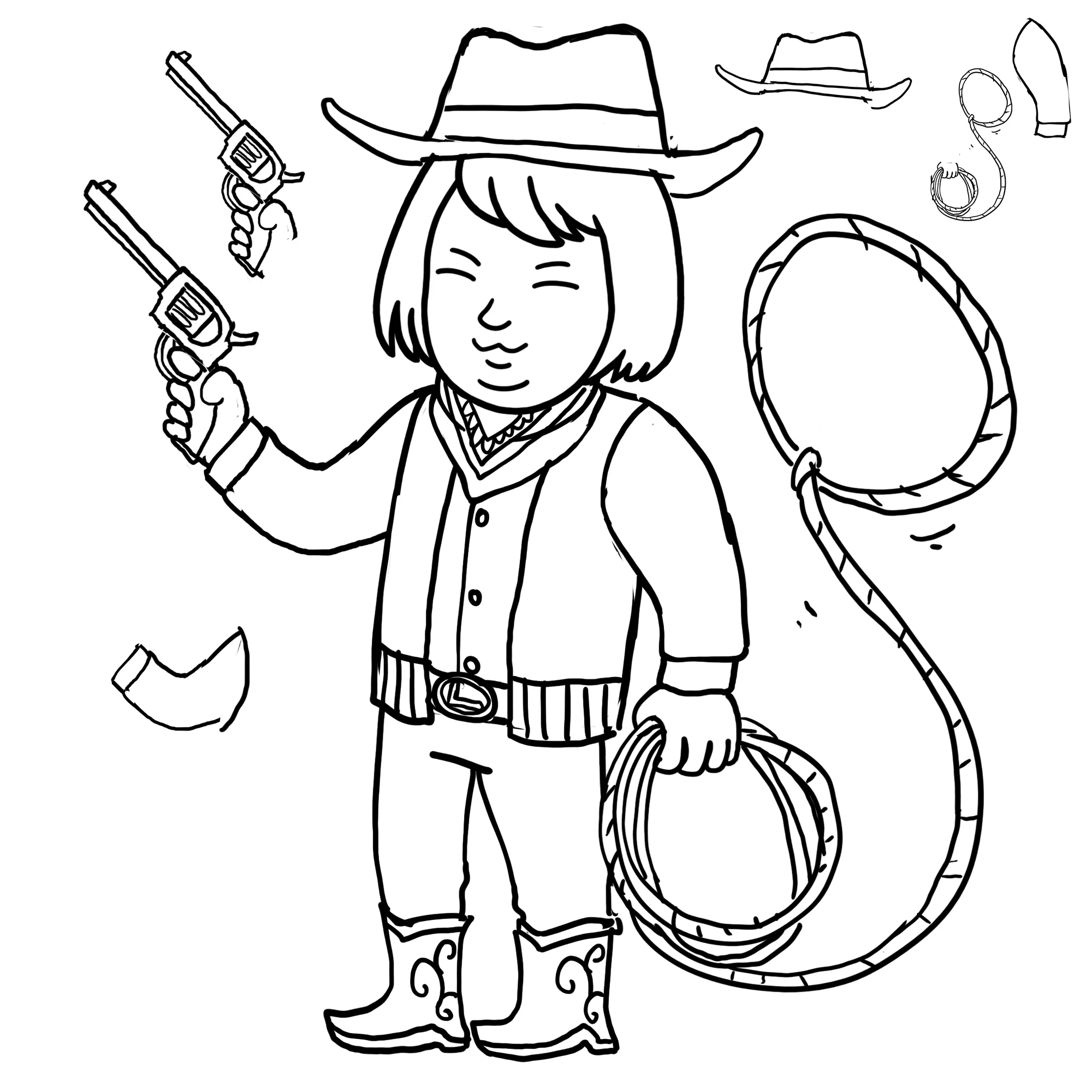 LingsCars mascot concept sketch: Cowboy Ling with modular accessories