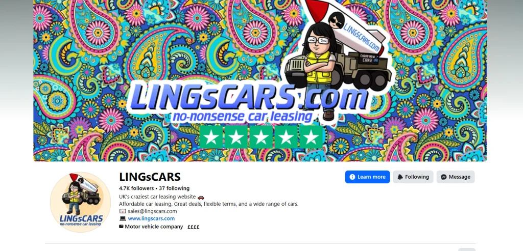 LingsCars Facebook page with mascot deployed as profile and cover image
